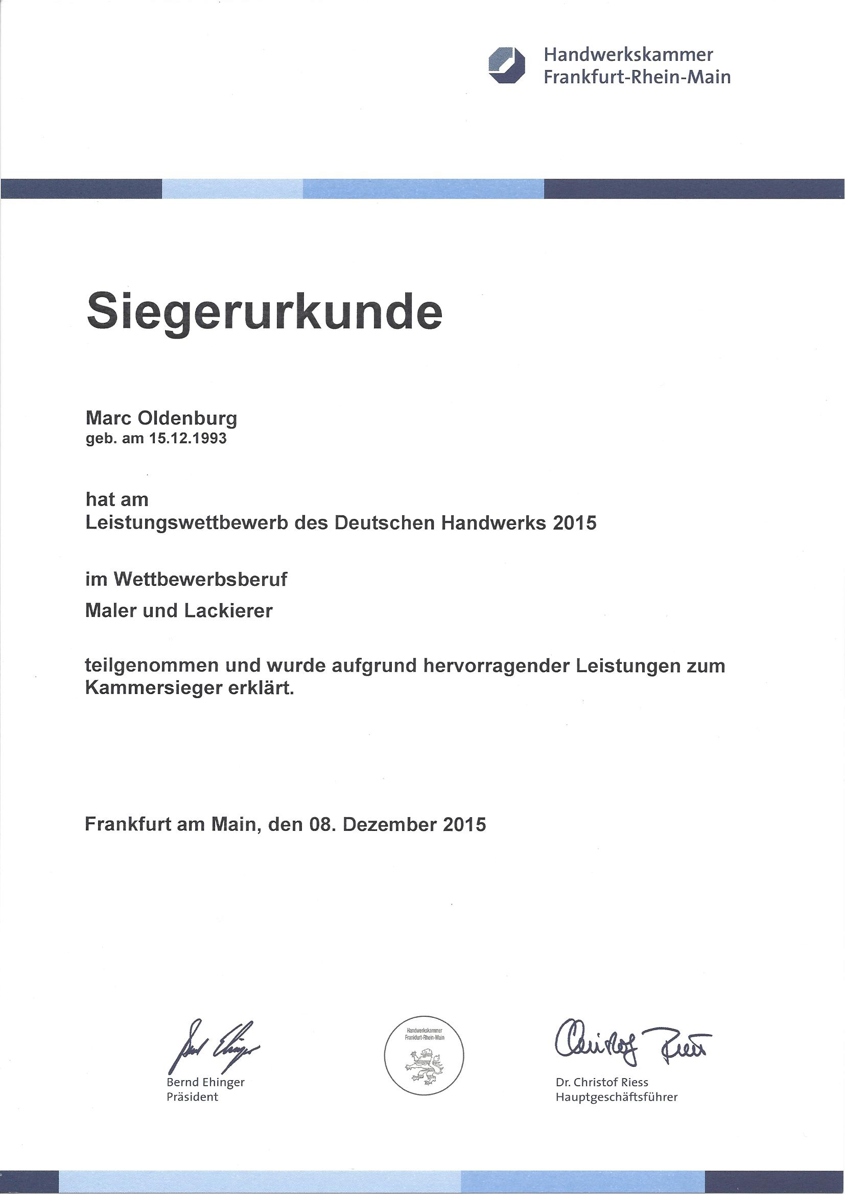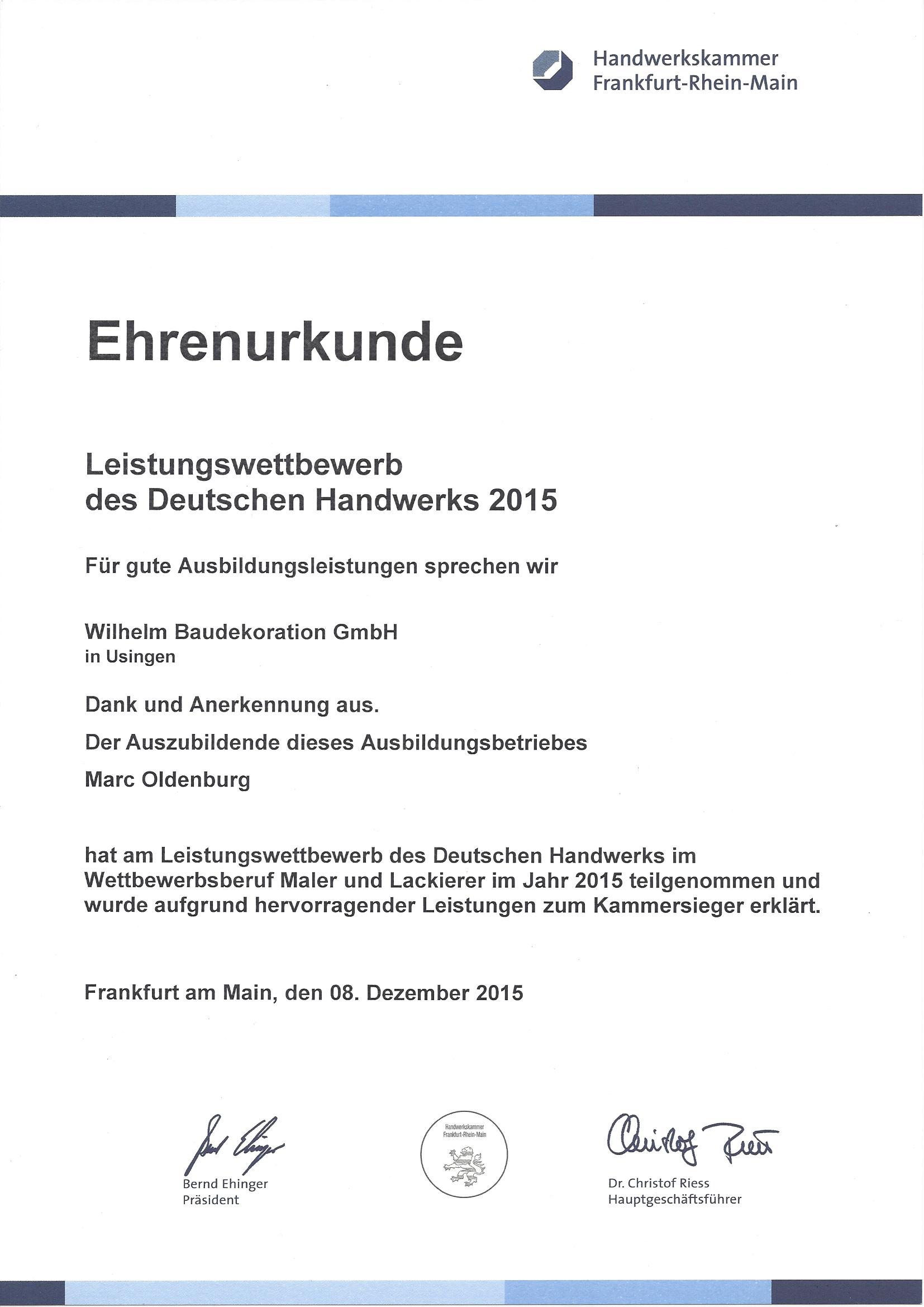 Der Kammersieger im praktischen Leistungswettbewerb der Handwerksjugend im Bezirk Frankfurt Rhein-Main kommt dieses Jahr von der Wilhelm Baudekoration GmbH.