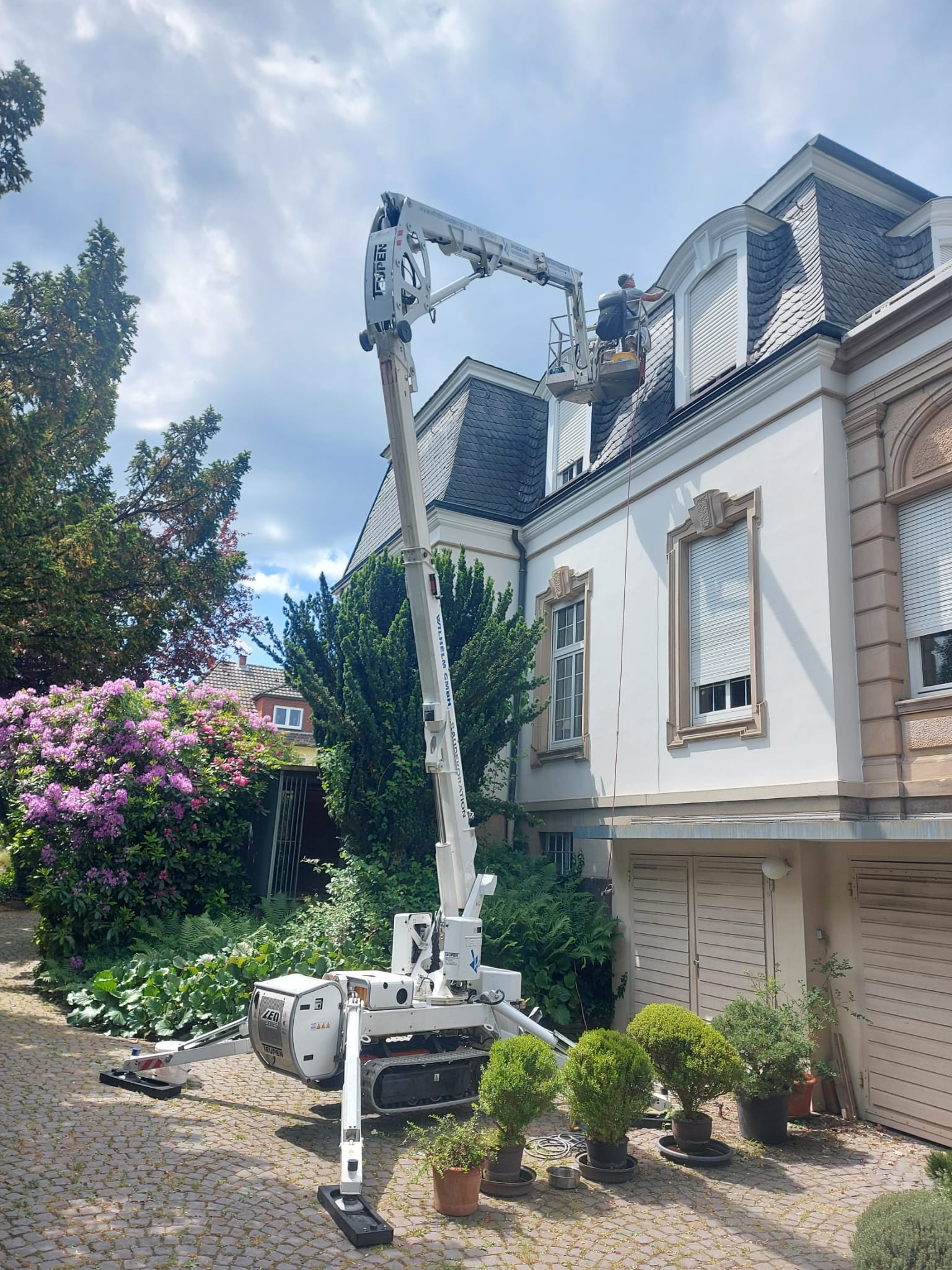 Fast täglich ist unser neuer Steiger im Einsatz. Unsere Kunden staunen, wie schnell Holzanstricharbeiten an Dachuntersichten erledigt werden können, wenn nicht aufwendig Gerüst gestellt (und auch wieder abgebaut) werden muss.