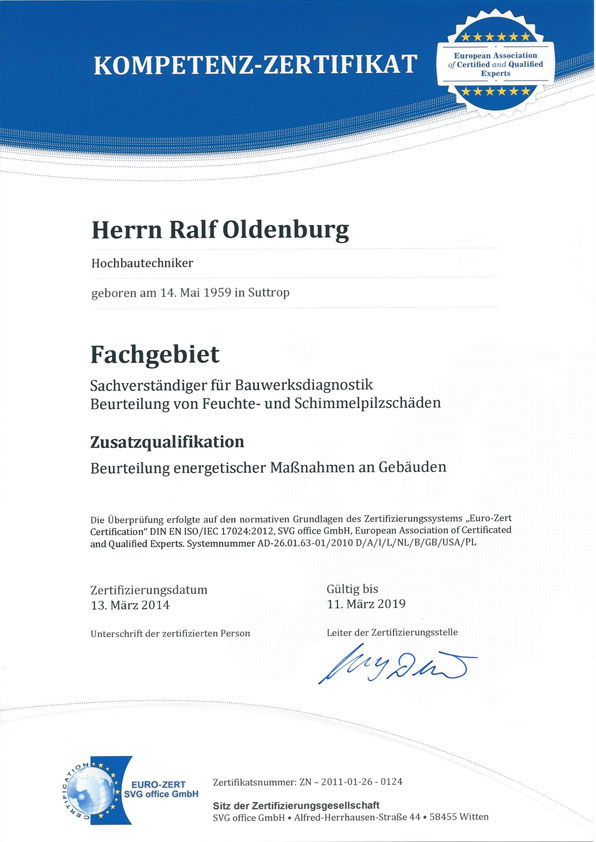 Ralf Oldenburg ist seit dem 16.2.2011 zertifizierter Bauwerksdiagnostiker nach DIN EN ISO/IEC 17024:2003. Die Fachgebiete sind allgemeine Bauwerksdiagnostik, Beurteilung von Feuchte- und Schimmelpilzschäden sowie die Beurteilung energetischer Maßnahmen an Gebäuden.